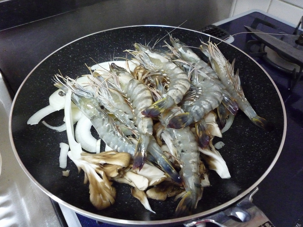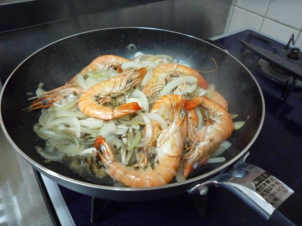 海老は頭も殻もついている状態で炒めた方が、玉葱に出汁が移って風味が良くなることに気がつきました。