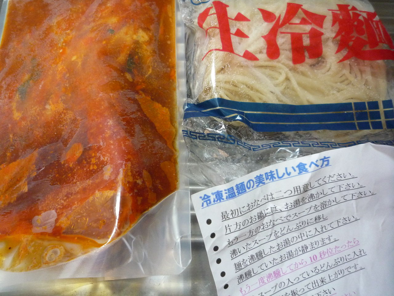 冷麺の麺を使用した温かくて辛いラーメン、温麺。