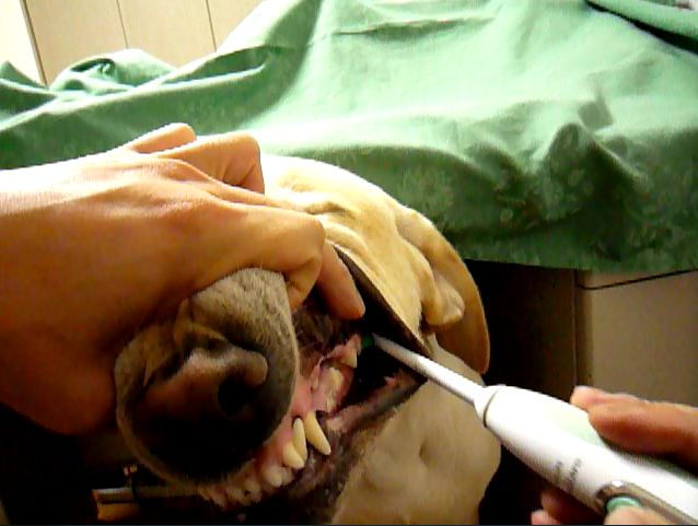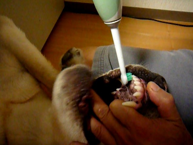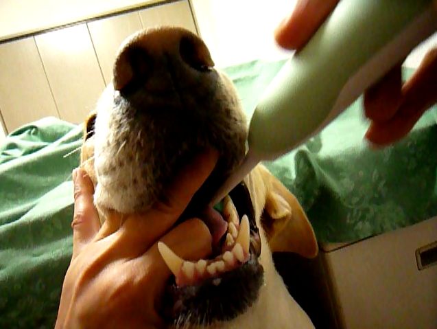 説明文:「Their teeth of the pet dog are brushed with the small brush of Sonicare every day. Like humans,It is important to put out the dental plaque of a periodontal pocket.」