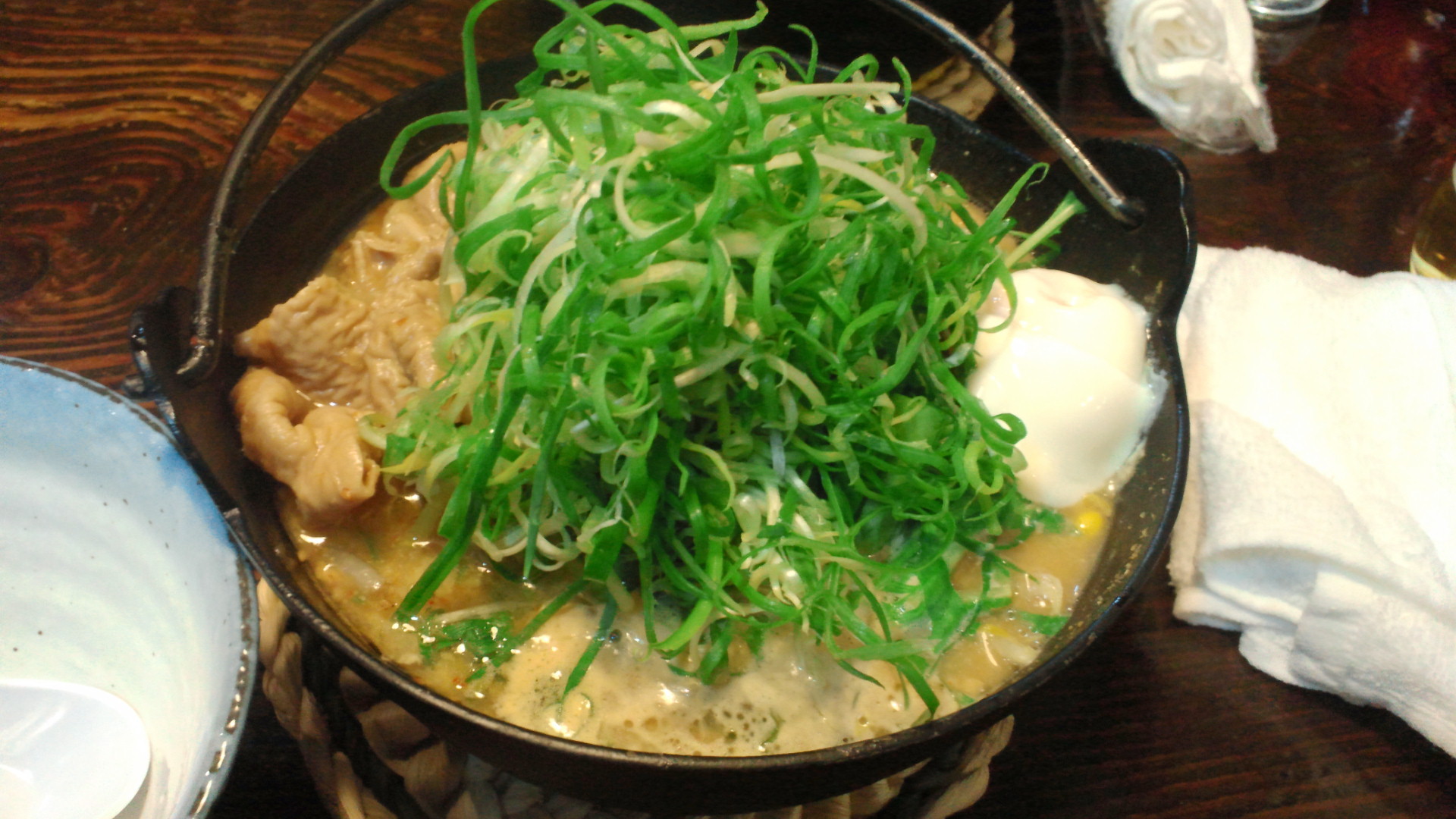 豚モツ、半熟卵、コーン、モヤシ、ネギ、水菜、メンマ、ワカメ・・・