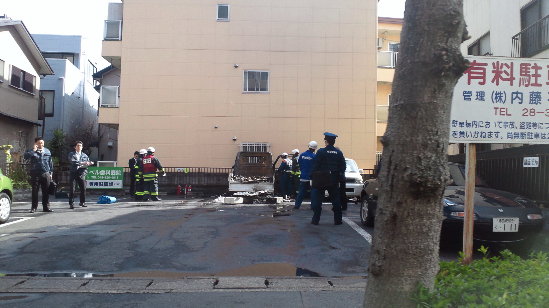 草加駅近く、とある月極駐車場で車が炎上してたらしいです。