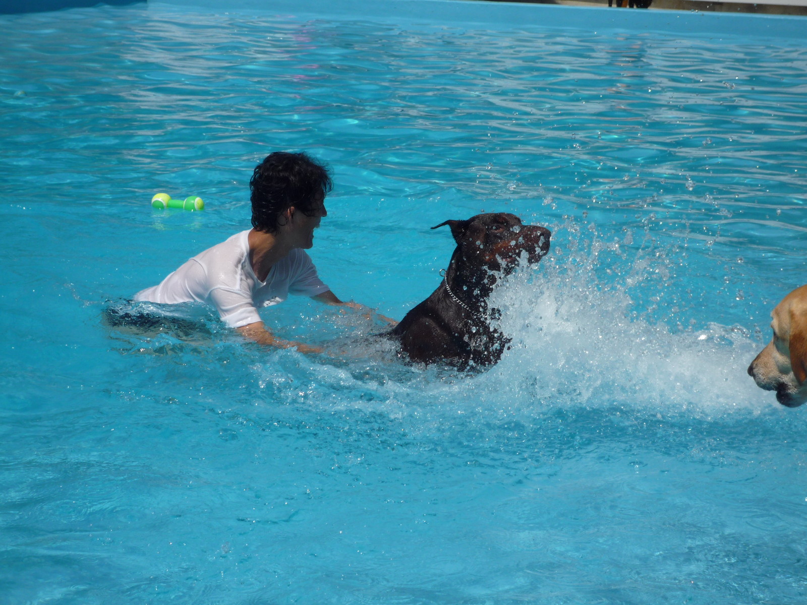 必死に、溺れるように泳ぐ?ドーベルマン。