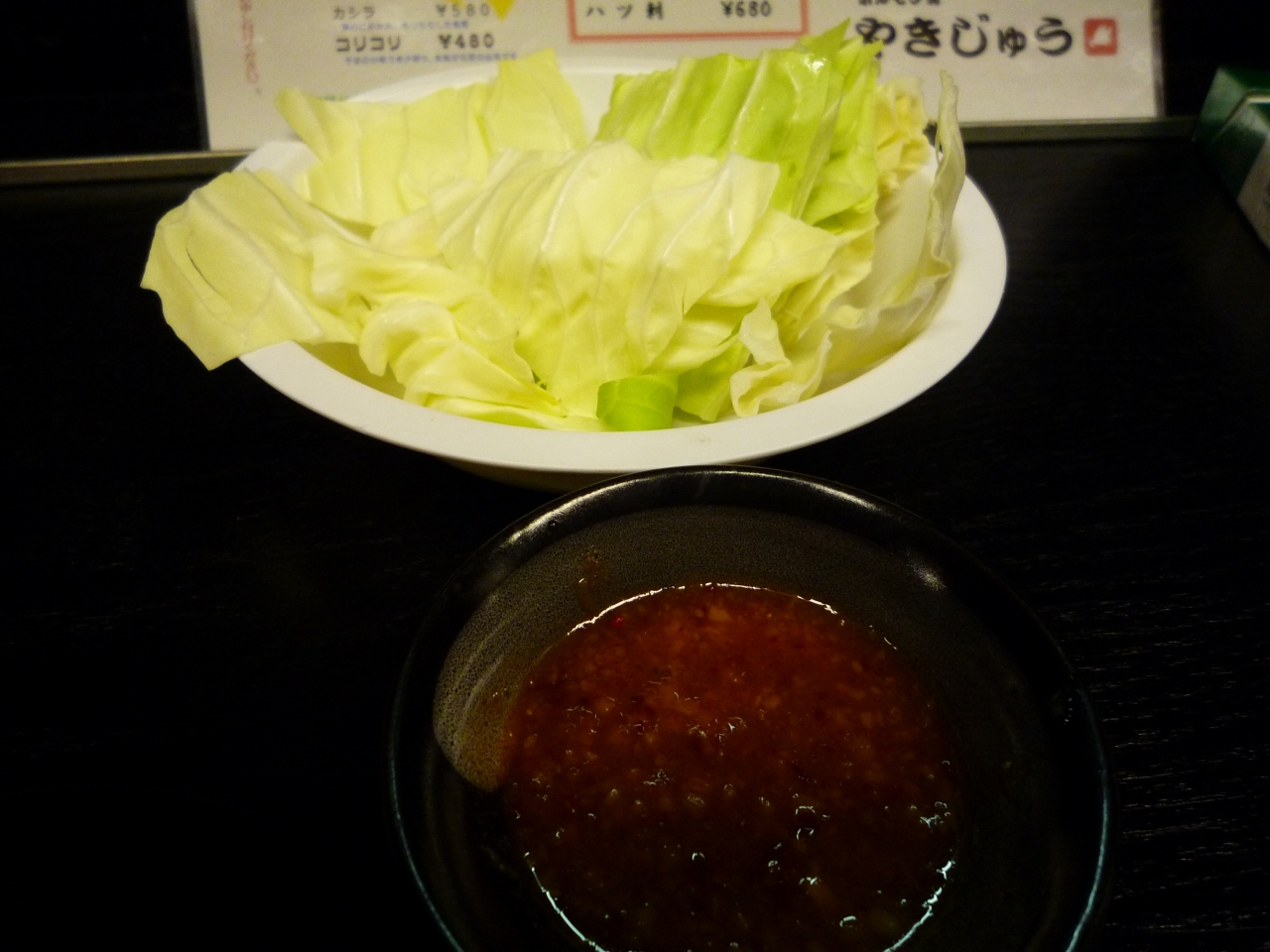 お通しは210円でおかわり自由の生キャベツ。