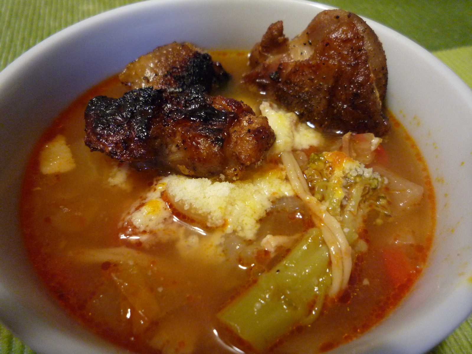 昨日のミネストローネに、カリカリに焼いた鶏もも肉をトッピング。