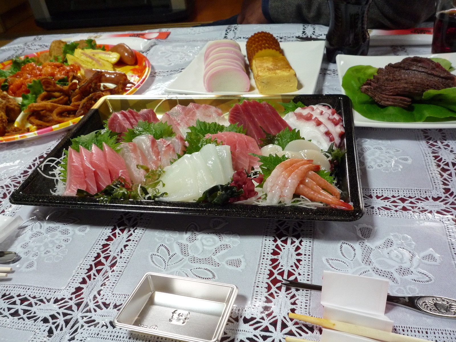 エビフライ、唐揚げ、エビチリ、ゲソ揚げ、ポテトフライ・・・お刺身。