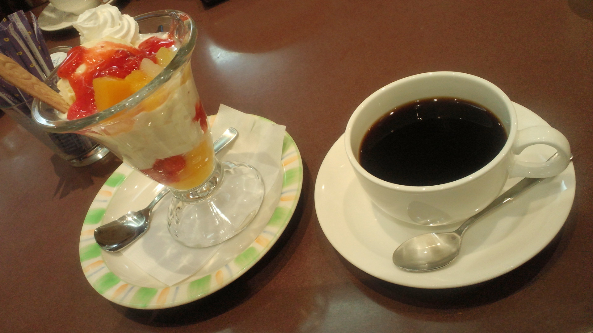 杏仁豆腐フルーツパフェと冷め切ったコーヒー