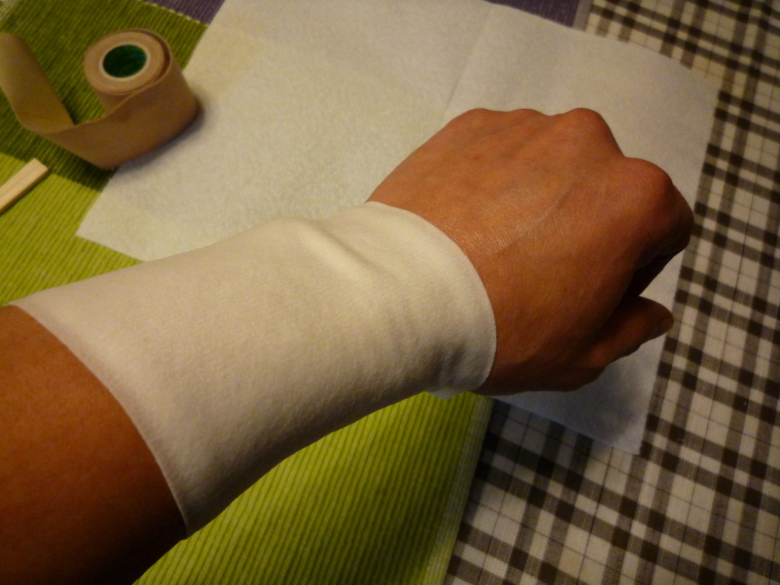 電気治療装置は無いので諦めて、大きめのボールに熱めのお湯を張り、10分ぐらい手首まで浸けて(冷めてきたら途中流湯しながら)、ポッカポカにしたあと・・・