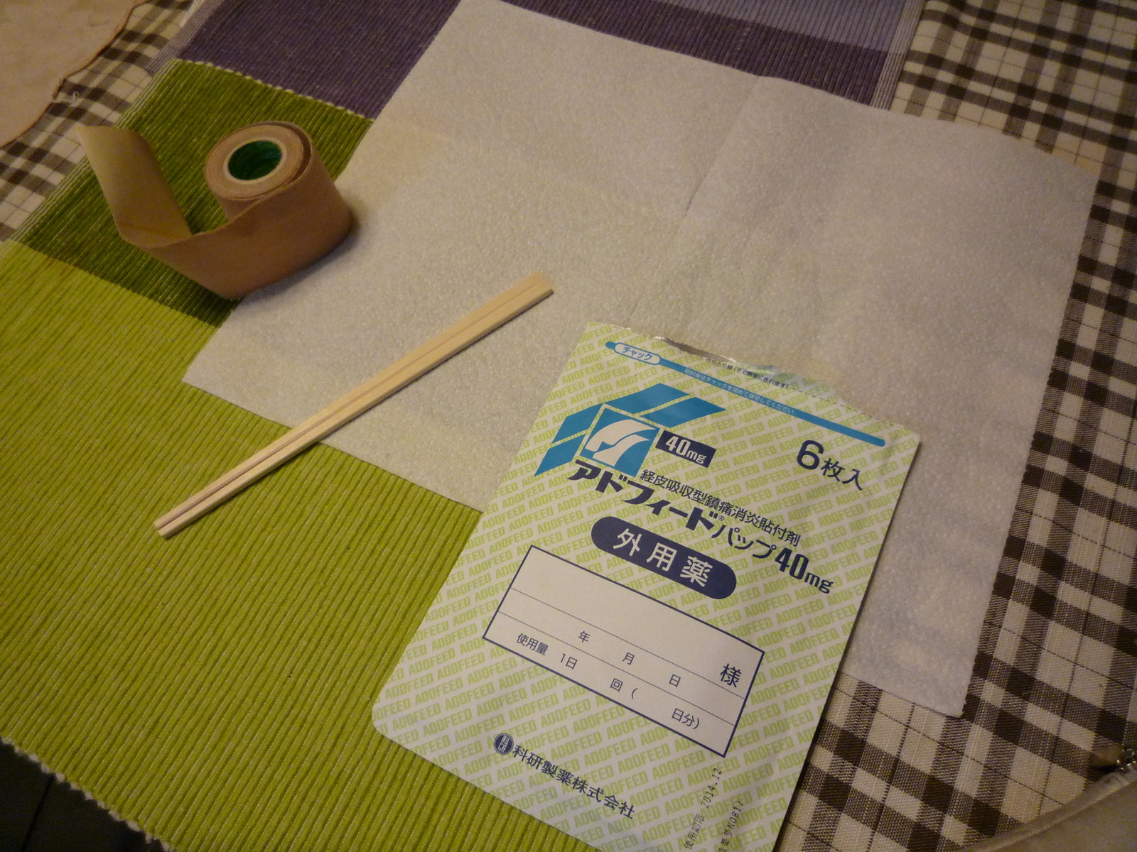 湿布、キッチンタオル、割り箸、テーピングテープ・・・