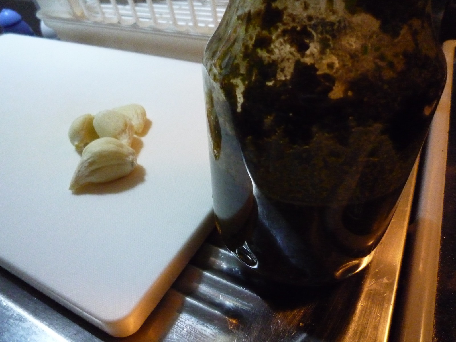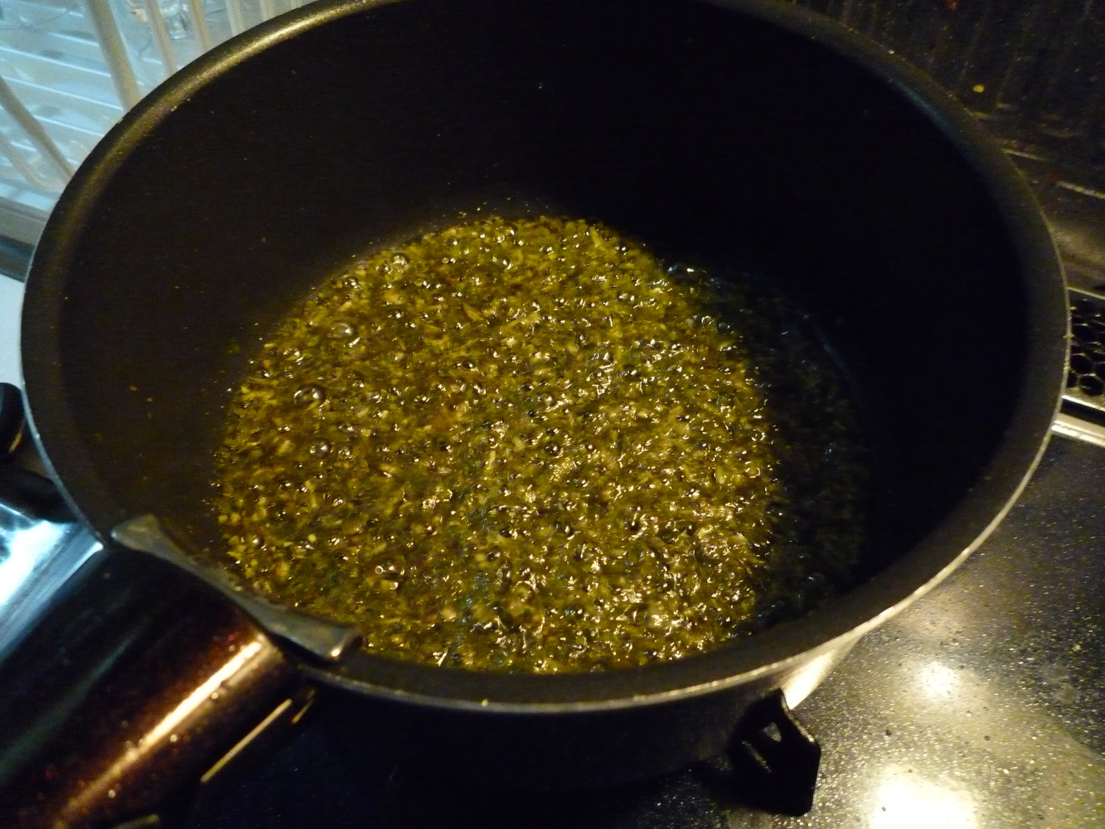 作り置きのジェノベーゼにオリーブオイルを足して、ニンニクを炒め中。