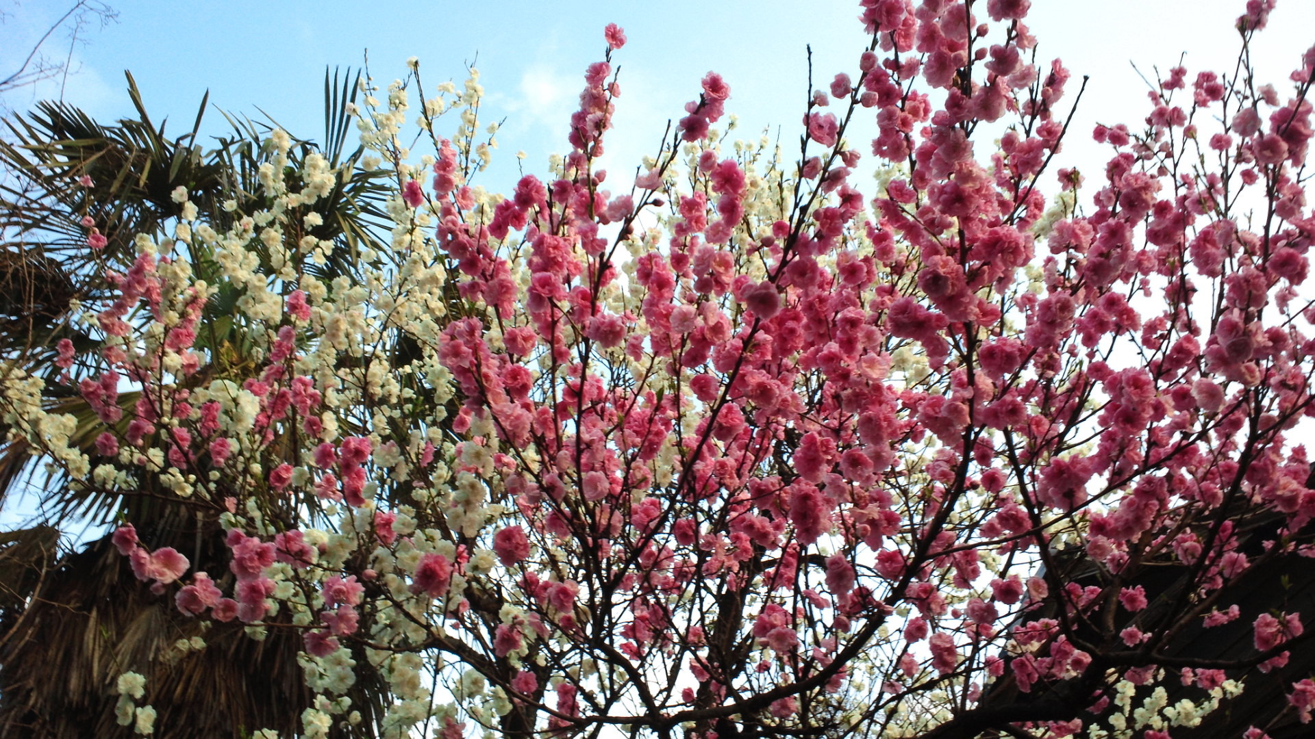 一本の木から赤と白の花。