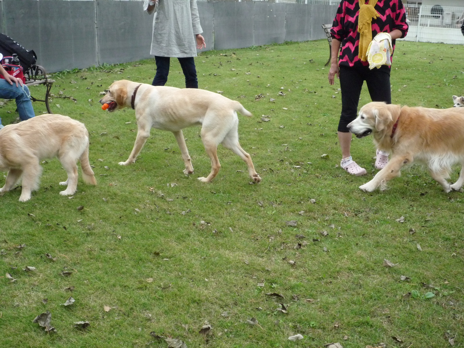 リードを繋いで、取り敢えずレトリバーだらけの別のエリアに避難する。