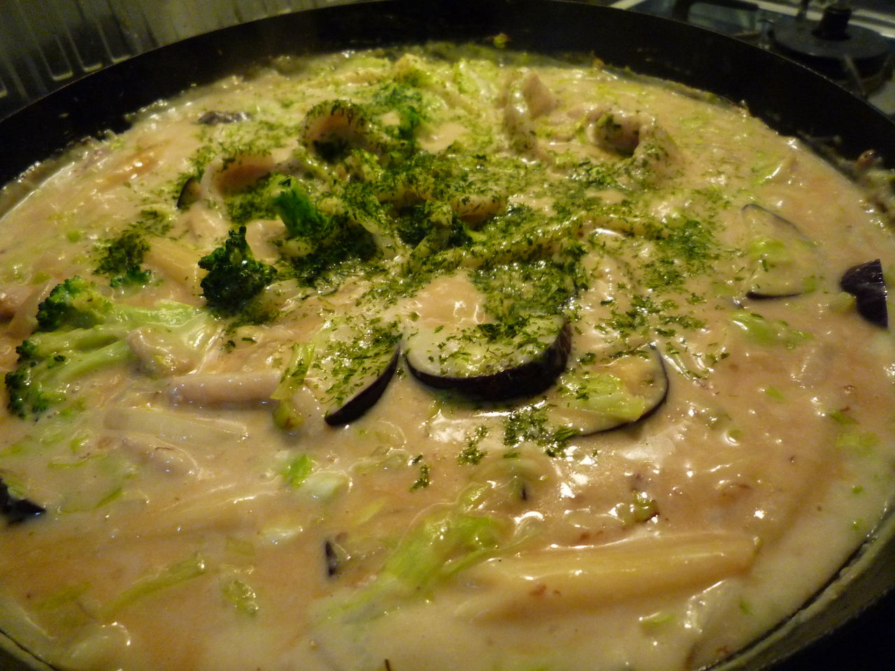 生地は薄力粉50gに牛乳600ccを少しづつ溶かしながら混ぜ、コンソメ、岩塩、ブラックペッパー、醤油です。