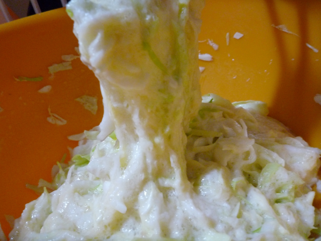 キャベツ4分の1に玉子を2つ、出汁を少々でかき混ぜて、