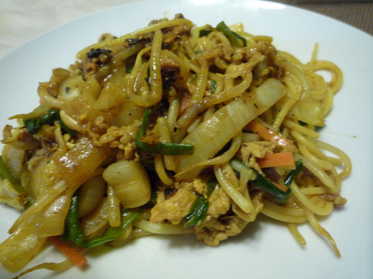 とりあえず、野菜炒めを作り、仕上げにカレー粉も加わったつけ汁をフライパンに流しこみ、トロ味が出来てきたところで茹で上がったパスタを投入してウスターかけて絡める。