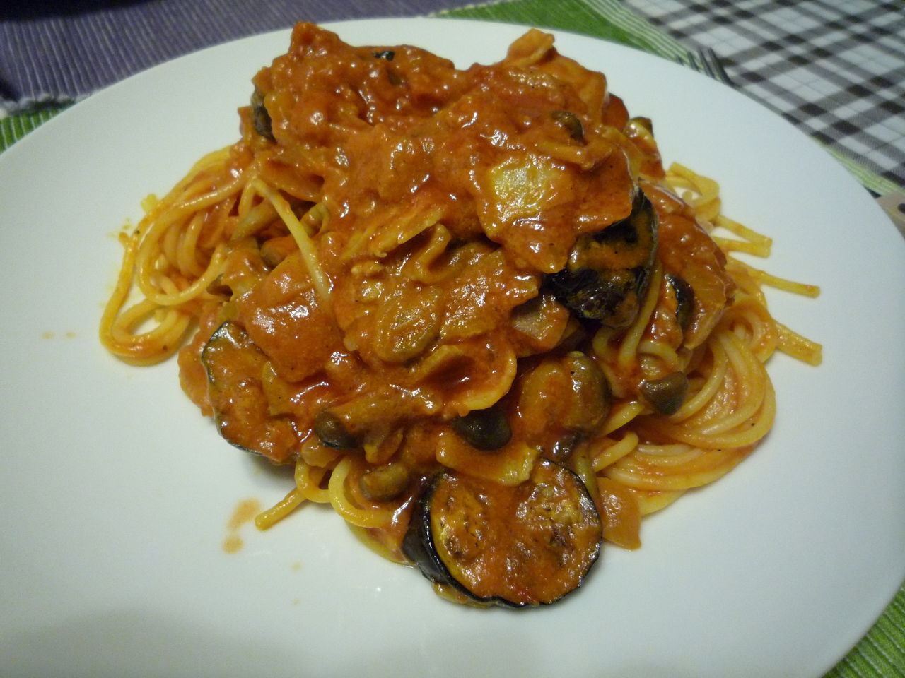 フライパンでソースを作る際、茄子は油を吸ってしまうので、一番最初に油を敷かずに焦げ目をつけています。