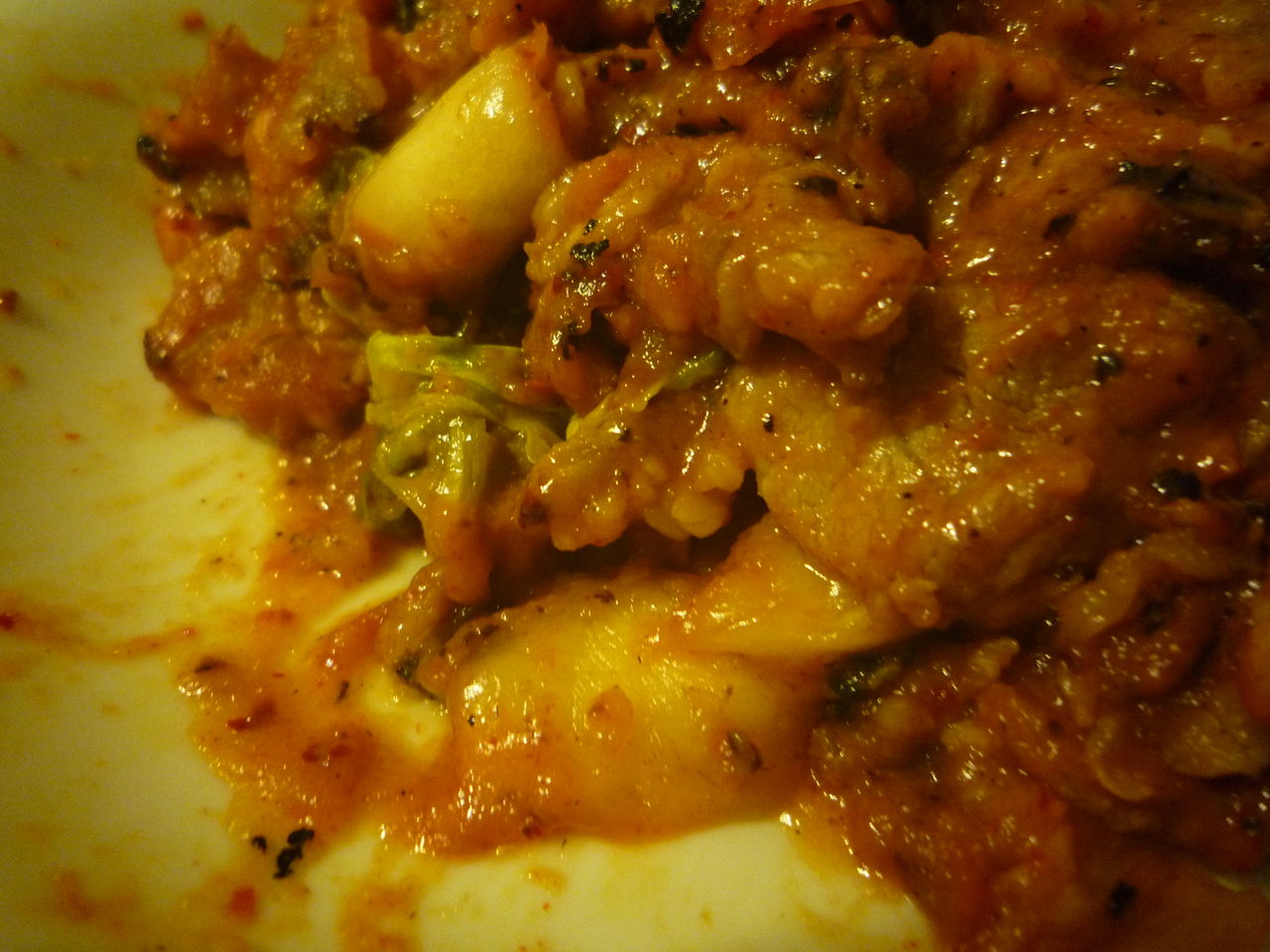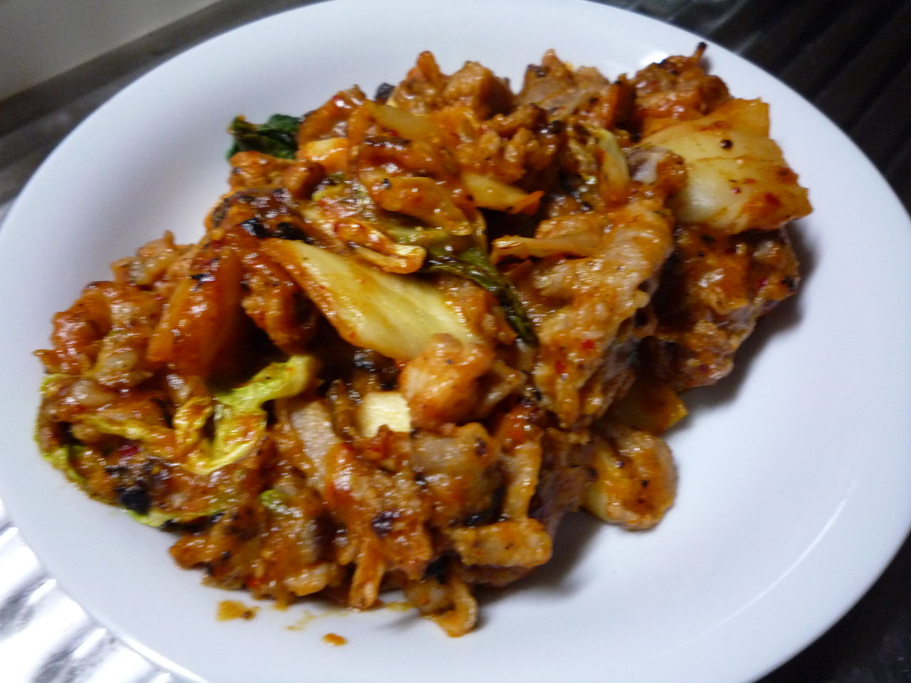 豚肉に火が通ったらキムチを入れて、最後につけ汁を回し入れて完成!