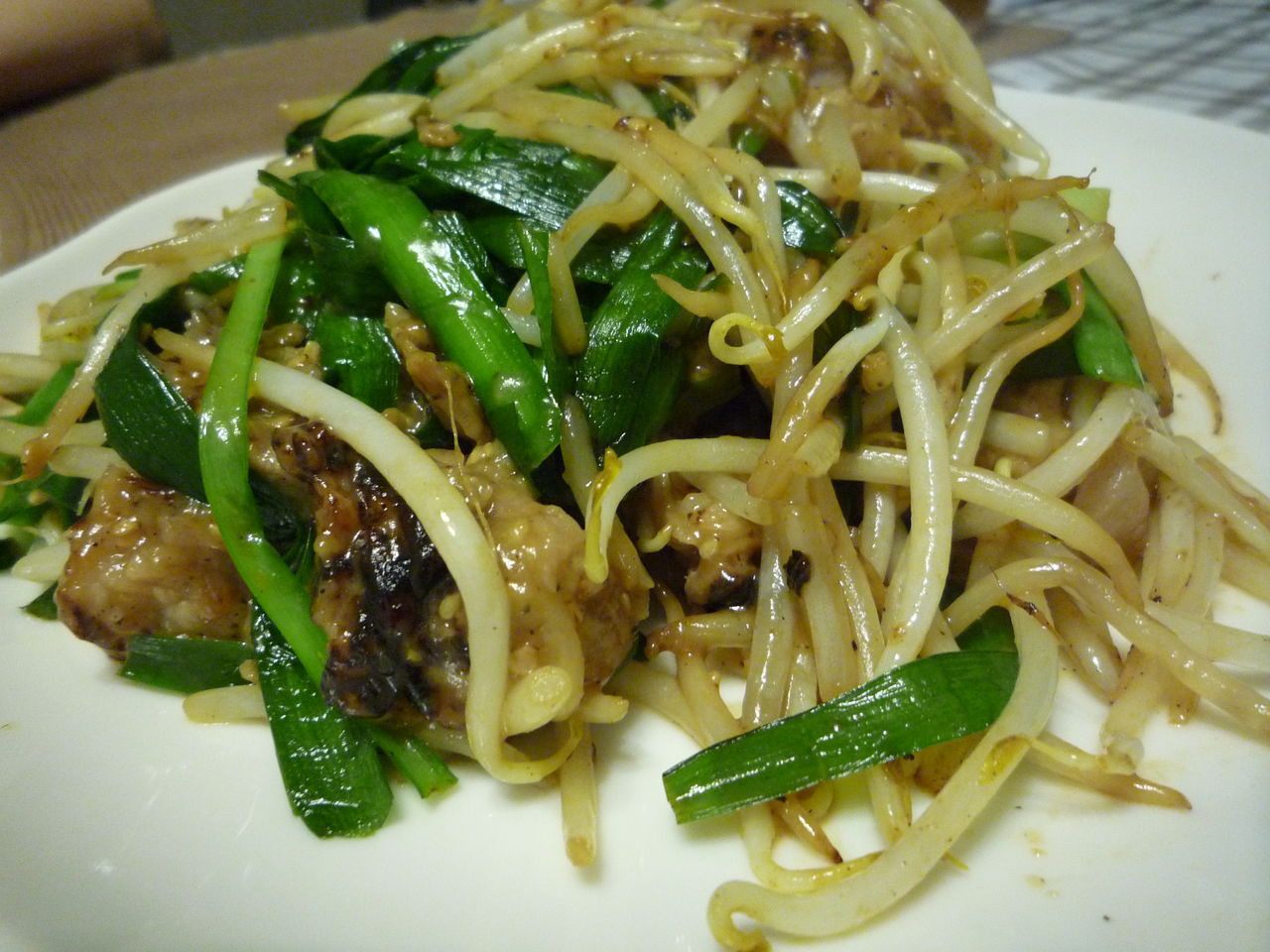 油返ししたフライパンに肉から入れて焼き、火が通ったところで数秒湯通ししたモヤシとニラを投入。